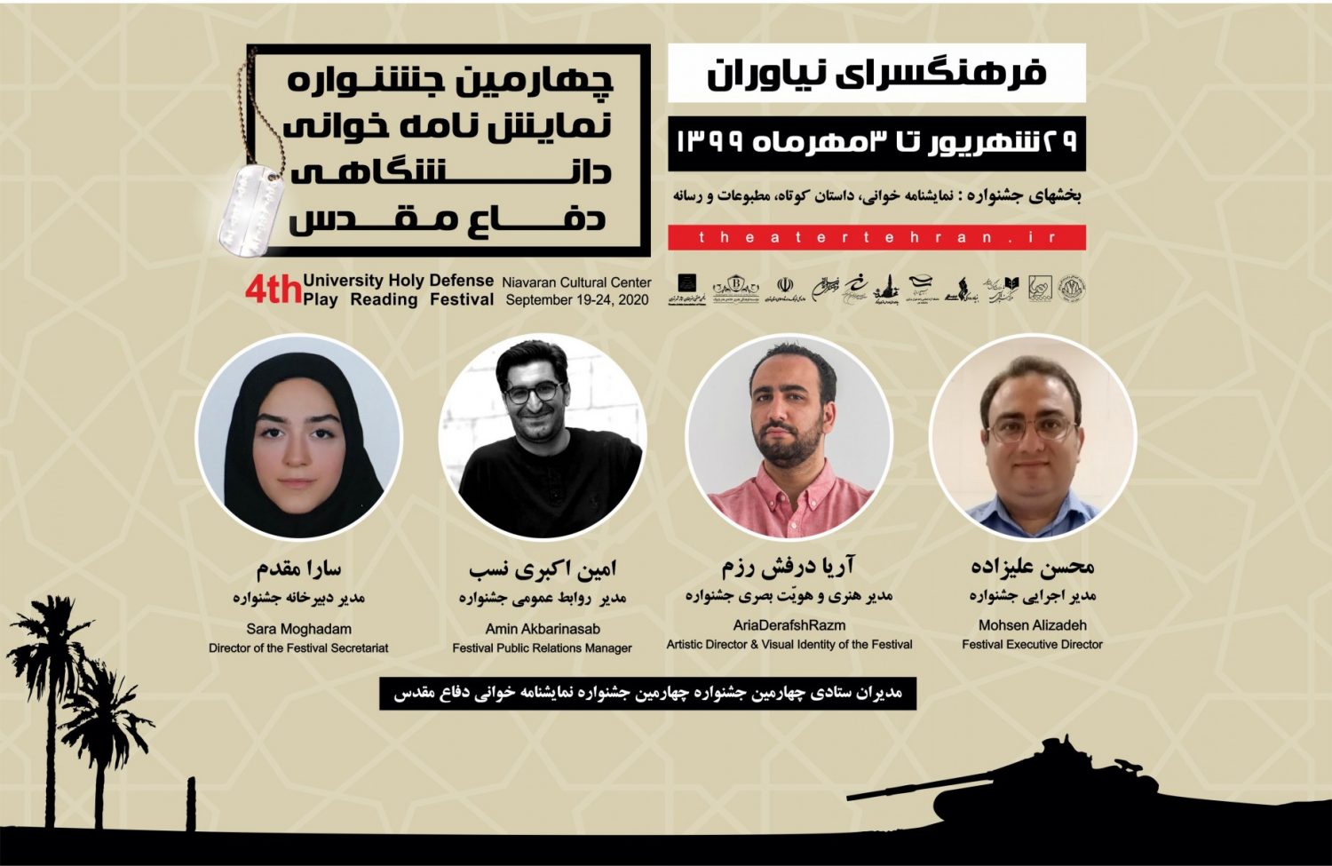 چهارمین جشنوارۀ نمایشنامه خوانی دفاع مقدس ، به همّت انجمن صنفی تئاتر تهران و اداره کل فرهنگ و ارشاد اسلامی استان تهران با همکاری فرهنگسرای نیاوران همزمان با فرارسیدن چهلمین سالروز آغاز هشتسال دفاع مقدس در سه بخش نمایشنامهخوانی، داستان کوتاه، مطبوعات و رسانه از ۲۹شهریور ماه لغایت ۳مهرماه ۱۳۹۹ در سالن گوشه و خلیج فارس فرهنگسرای نیاوران تهران با توجه به دستورالعمل ستاد ملی مدیریت بیماری کرونا برگزار خواهد شد.
